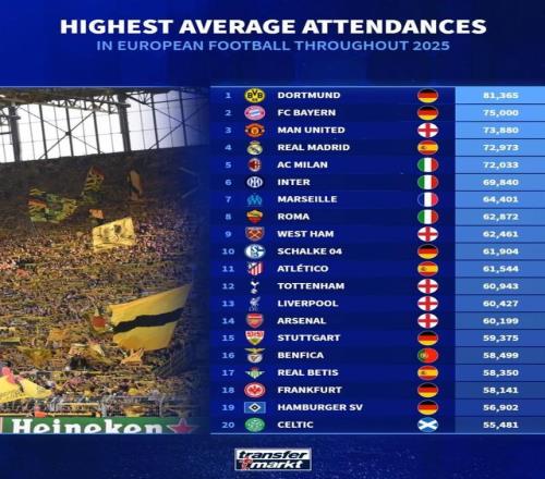 2025年歐洲俱樂部場均上座人數(shù):多特、拜仁、曼聯(lián)前三